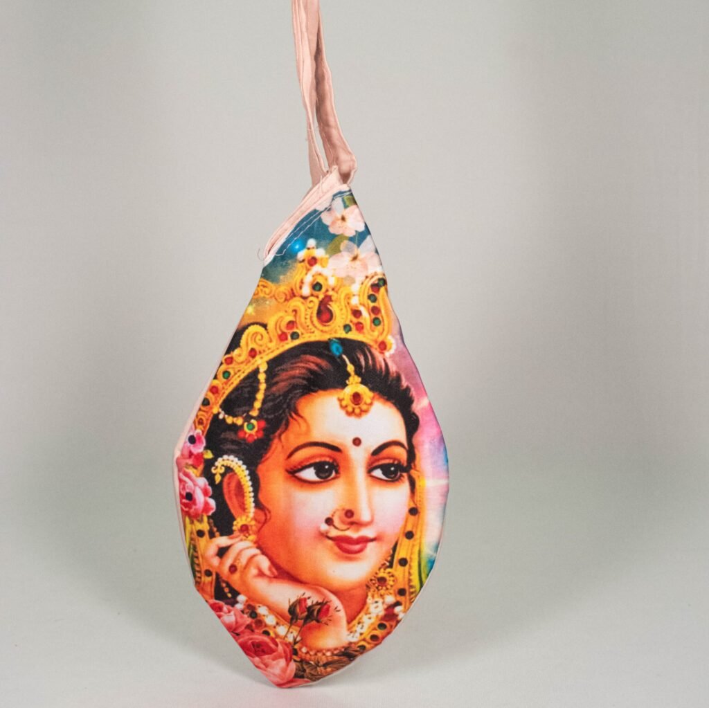 A devotional Gomukhi bead bag featuring the face of Radha, perfect for storing your Japa mala during meditation.