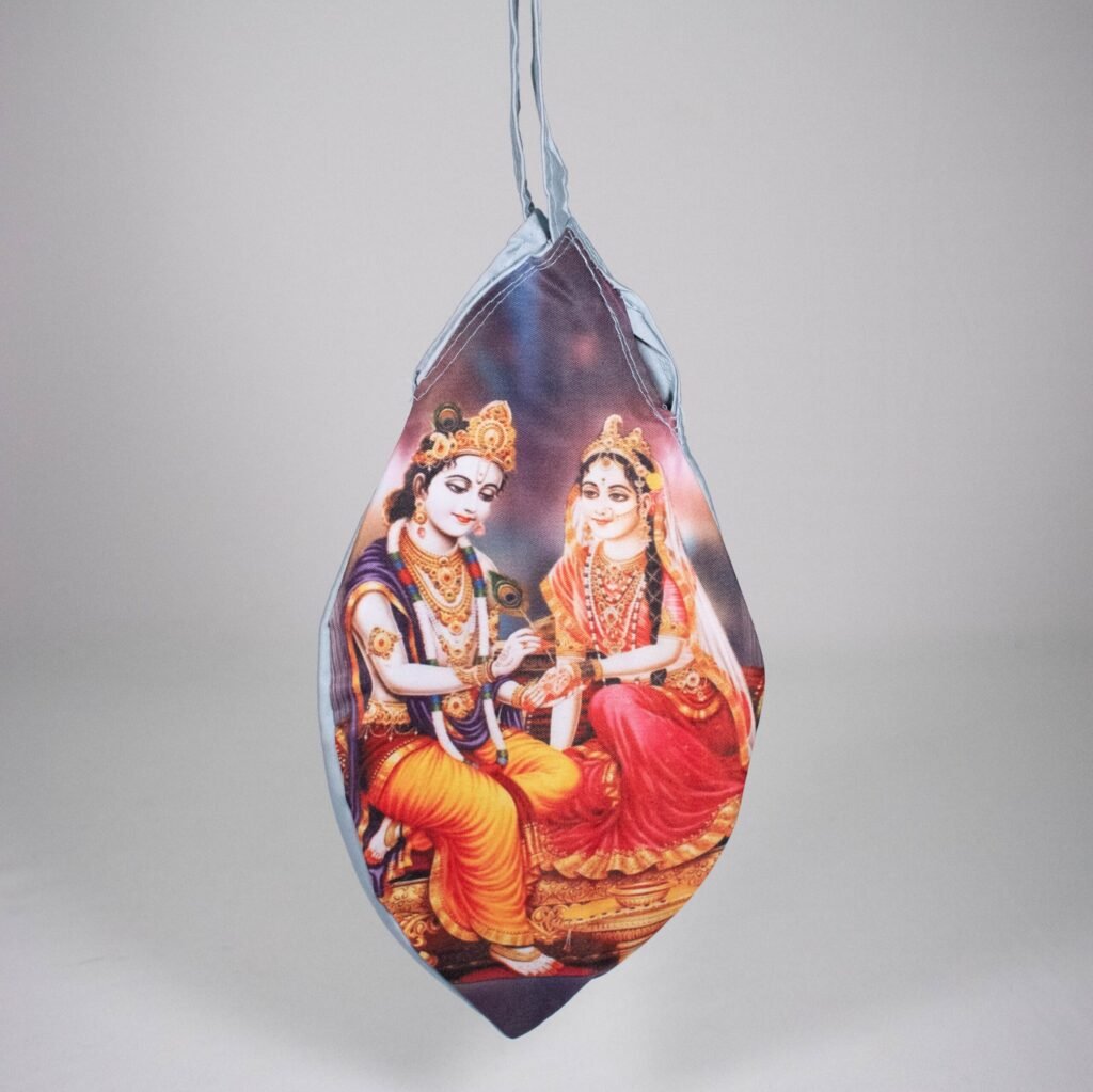 A devotional Gomukhi bead bag featuring the face of Radha, perfect for storing your Japa mala during meditation.