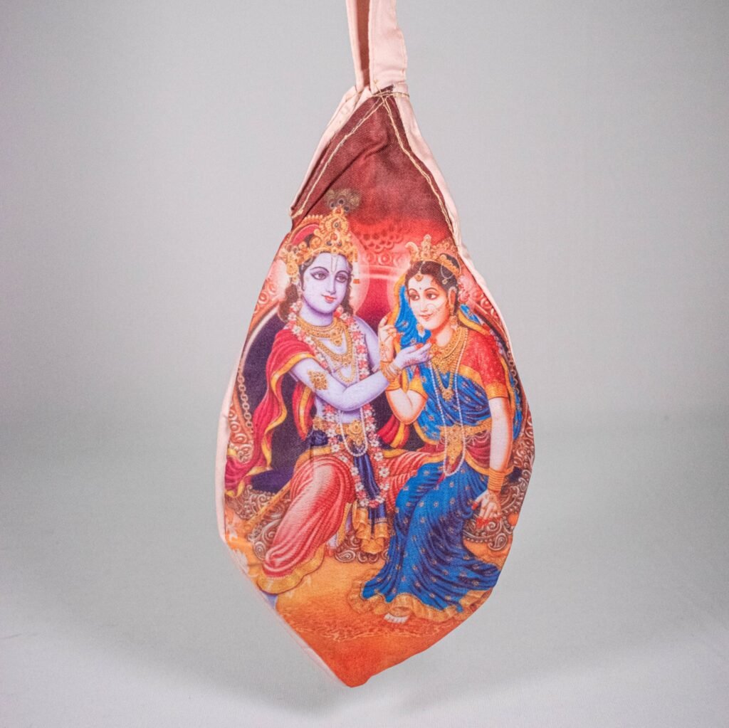 A beautifully designed Gomukhi bead bag with the faces of Radha and Krishna, ideal for devotional chanting and protecting your Japa mala.