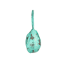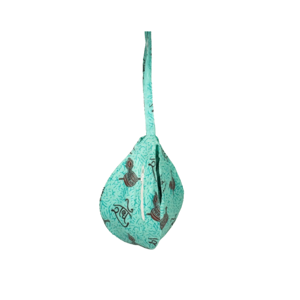 A green-colored Gomukhi bead bag featuring “Radhe” for storing and using your Japa mala during meditation and prayers.