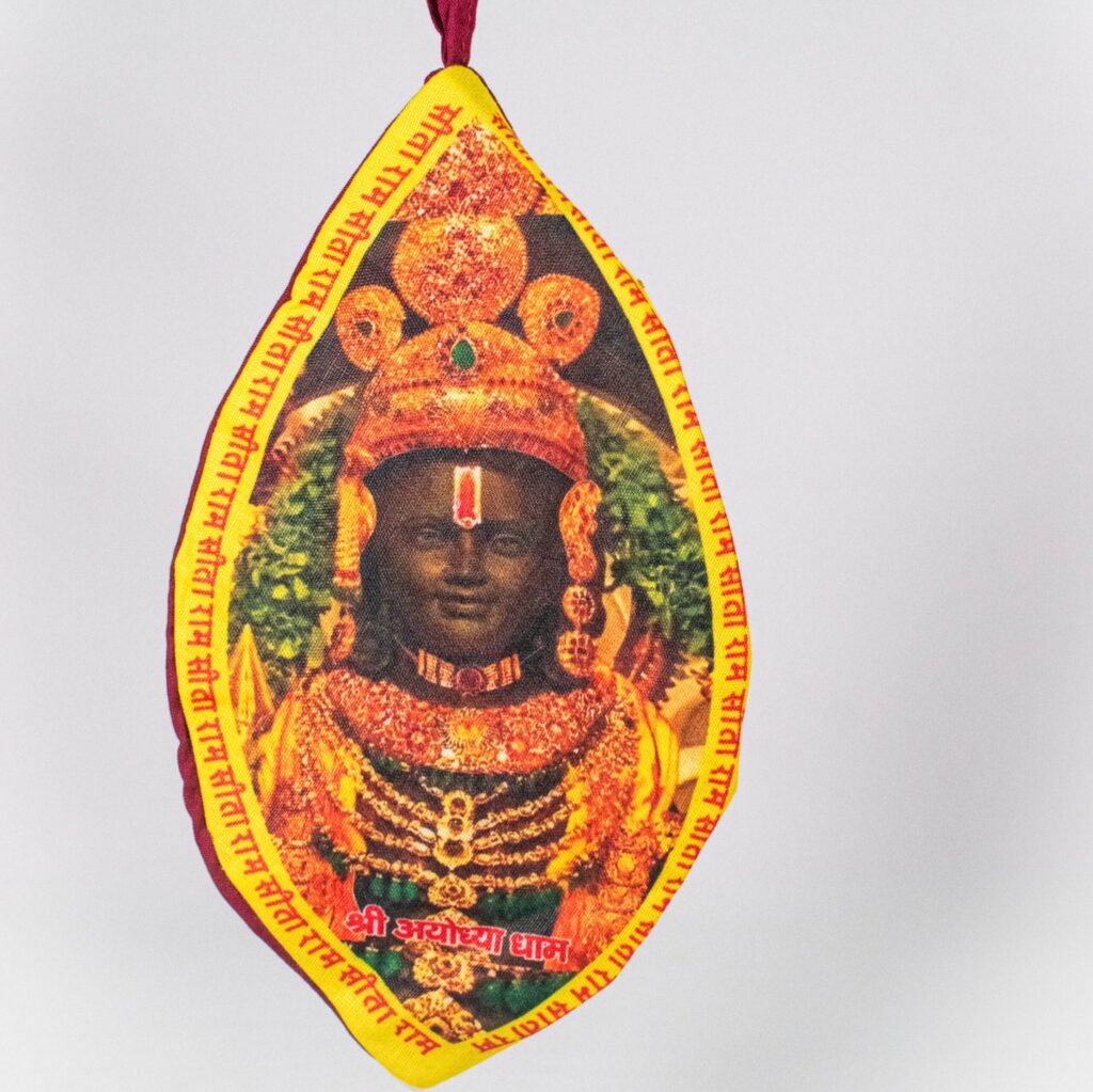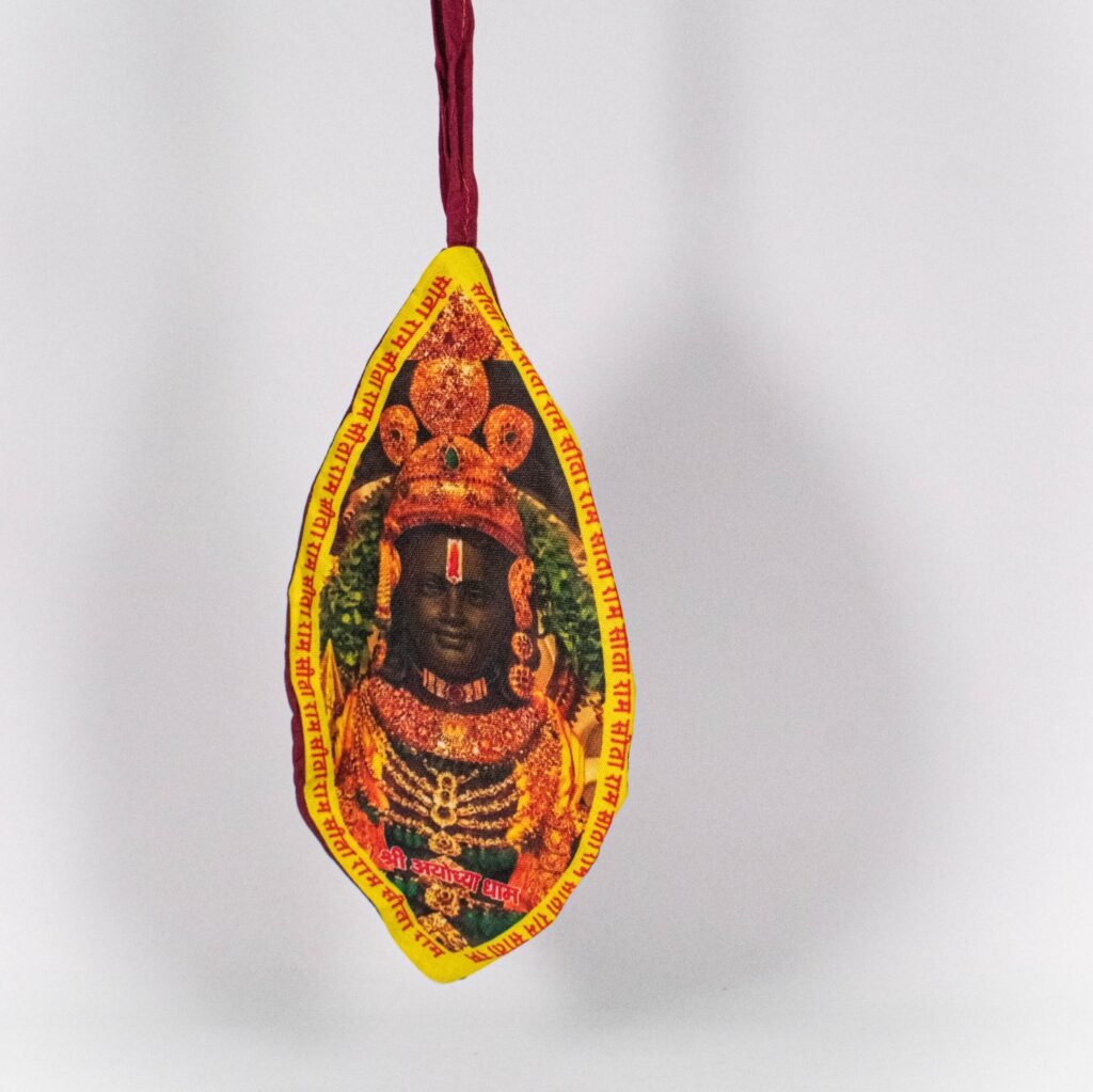 A gomukhi bead bag featuring the face of Shri Ram, designed for holding japa mala beads during prayer and meditation